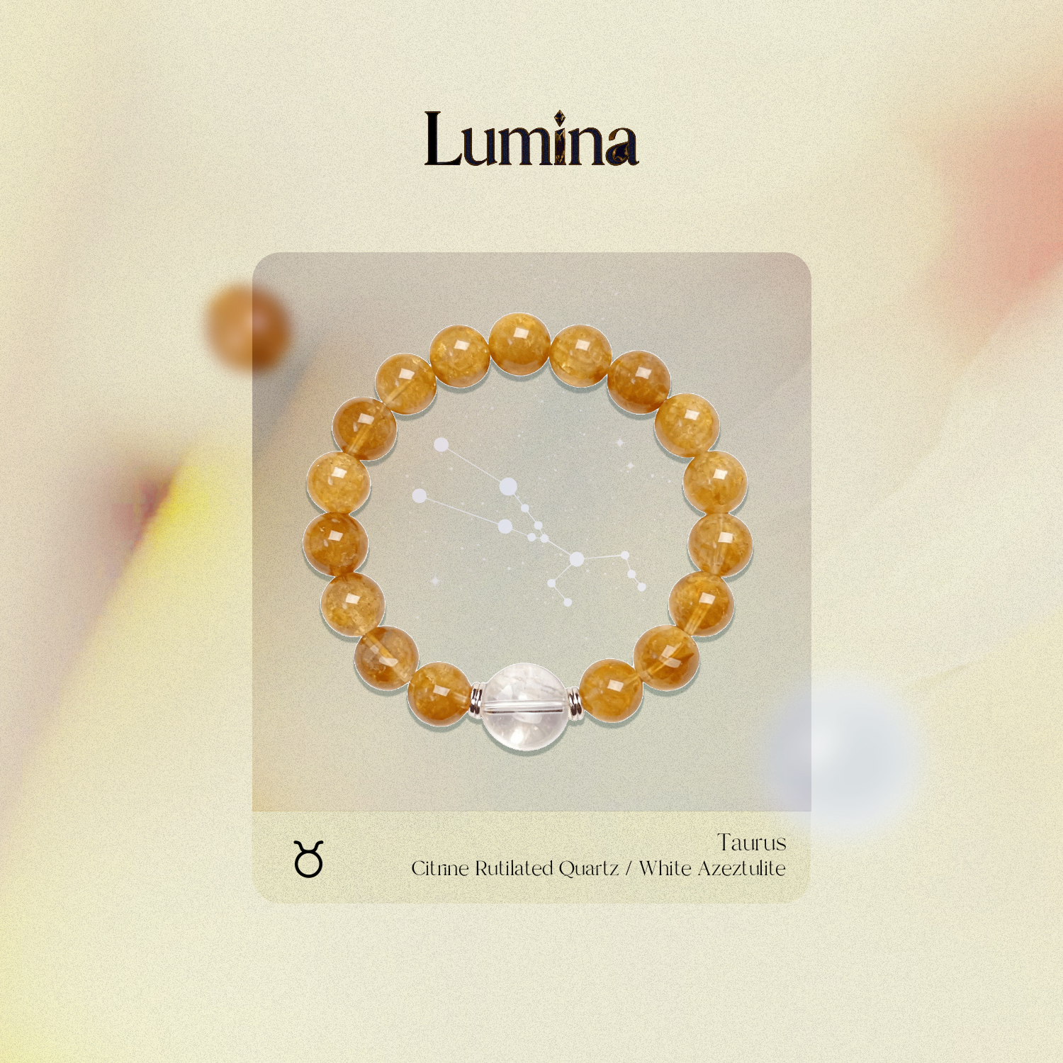 Each bead pairs golden rutile threads—like energy fast lanes—inside citrine, with the soft, luminous presence of White Azeztulite, echoing Taurus’ blend of earth stability and quiet spiritual growth.