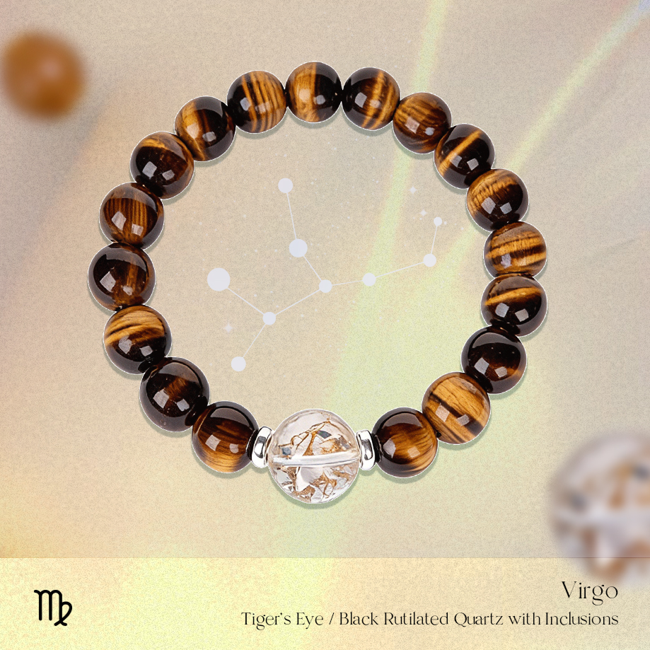 Each bracelet combines the grounded golden bands of Tiger’s Eye with the complex inclusions of Black Rutilated Quartz—mirroring Virgo’s ability to work with many variables and still create structure.